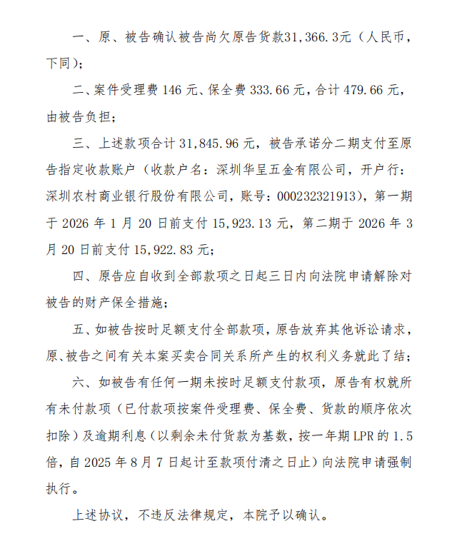 截至2026年2月4日 91抖音短视频,我司仍未收到调解约定的成大公司应付货款第一部分,并且无法正常联系沟通,目前我司已委托律师向法院申请强制执行。