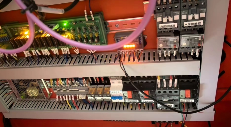 1,液压站无反应,无压力,我们检查电箱,液压站的控制器电路正常,继电器正常工作,但是液压站没有反压,电机不转,初步判断是液压站电机没有进电,这里我们首先去检查了继电器,工作正常 91黄瓜APP下载,判断有可能急停开关的控制有问题,急停后液压站会不工作,我们拆看面板发现面板的急停开关无异常,后检查电箱发现确实是信号线路松脱,拔插过后问题解决。